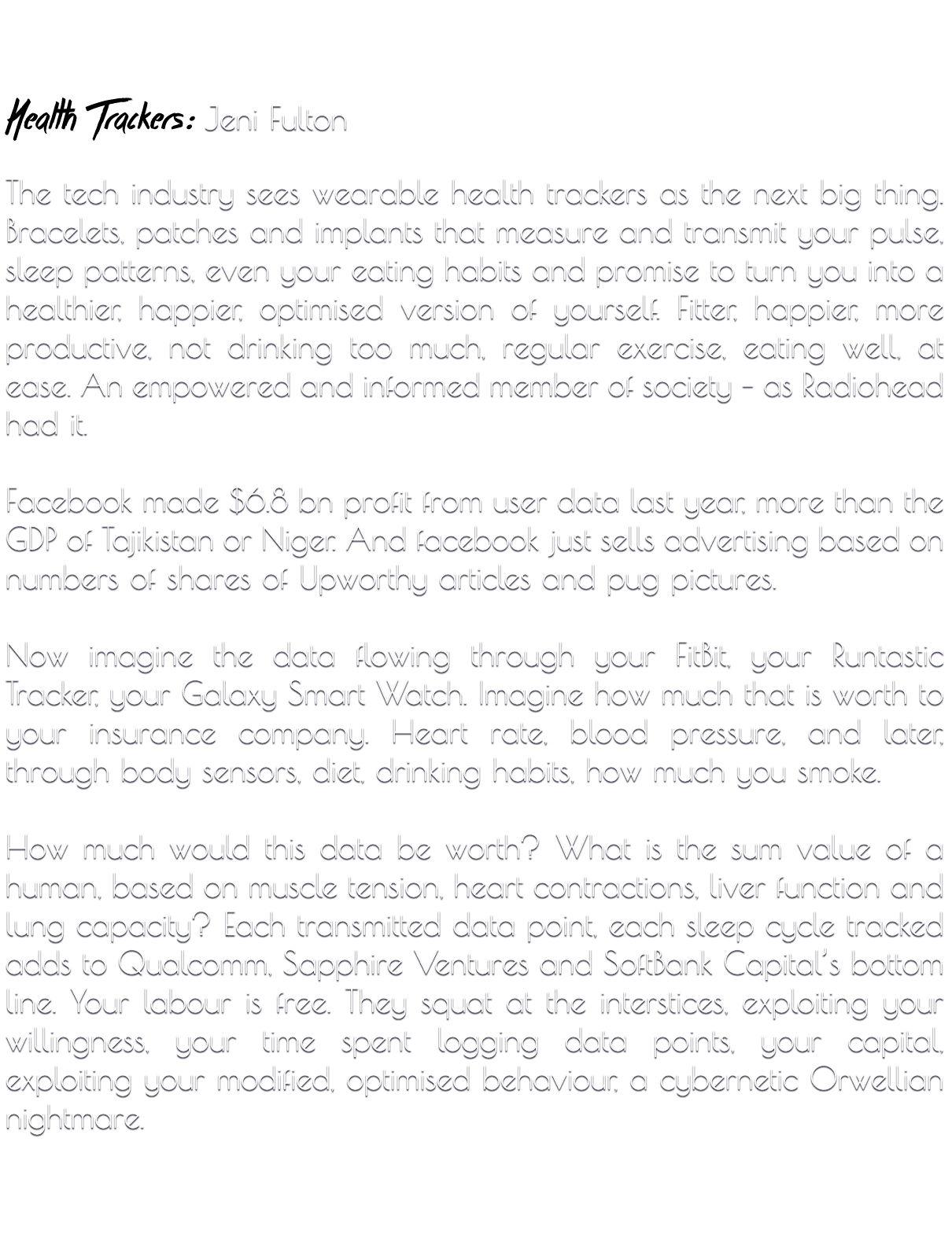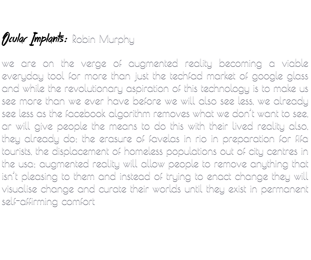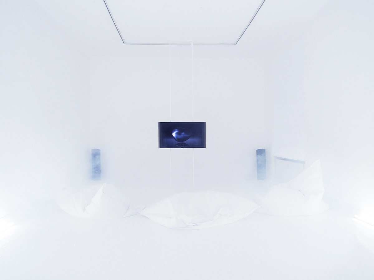 eStamina delves into the perceived possibilities of ‘human enhancement’ through technological means. The centrepiece of the show, a 60-minute ambient audio track accompanied by cg visuals in a drugged fog, involves scripted contributions from 26 others, including artists, musicians, curators and a neuroscientist. In compiling these varied accounts, a futuristic dreamscape emerges – a projection of anxieties and desires driven by the hyper-emotionalized and aestheticized ideals of the commercial sphere.