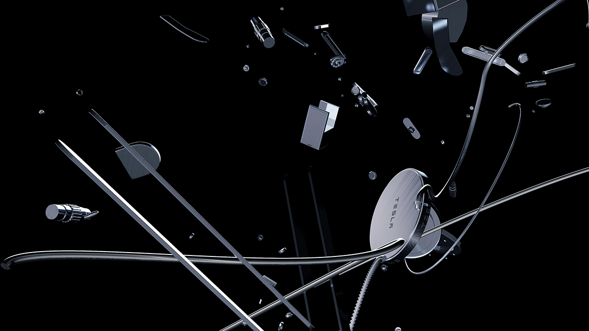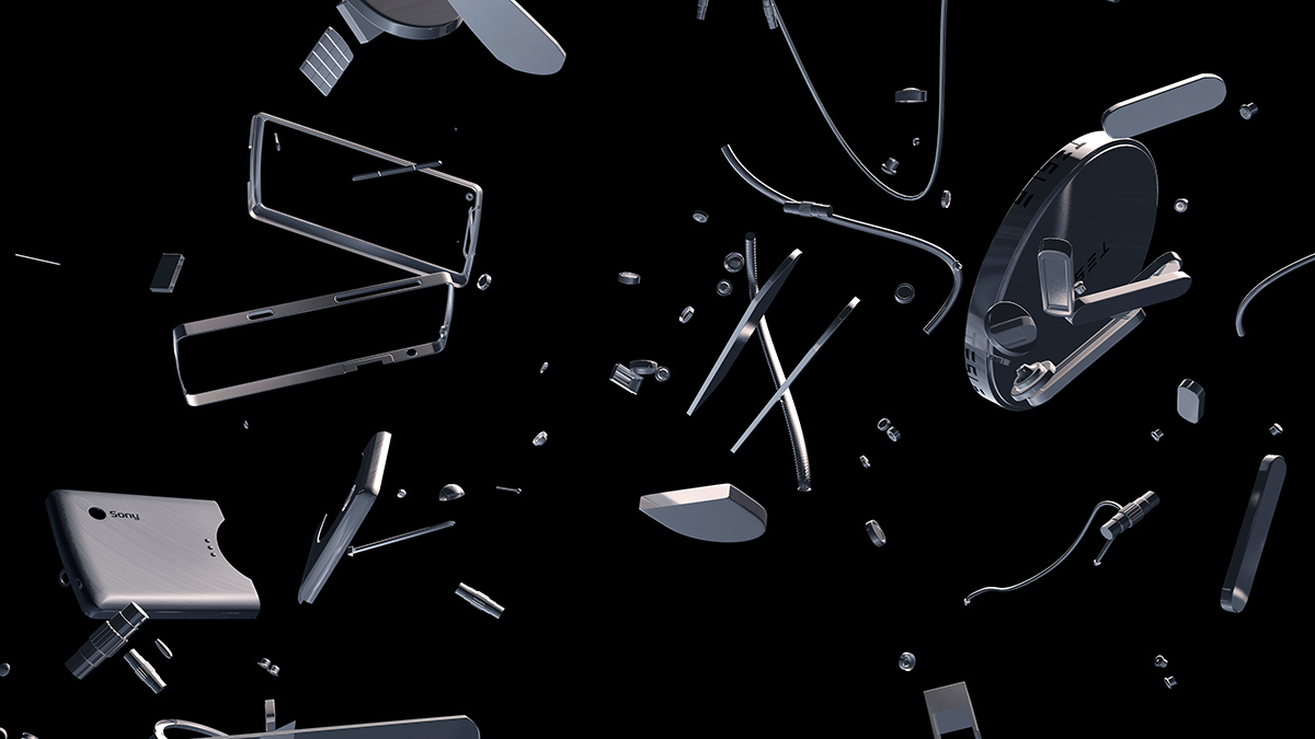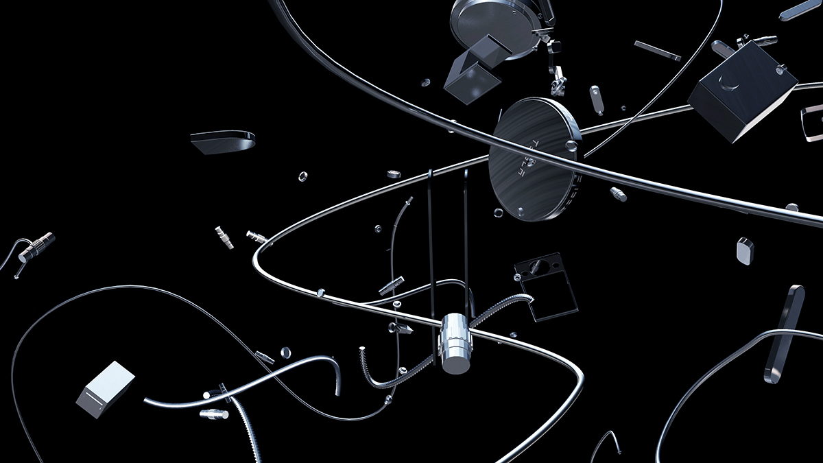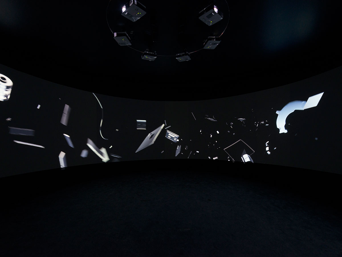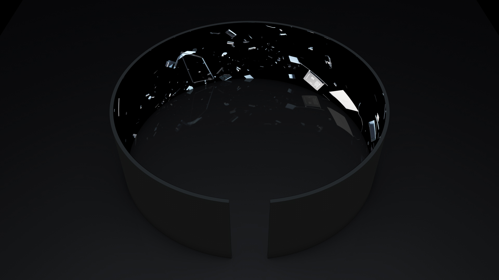 The visuals consist of a single scene — a 360-degree fly-through a cloud of technological debris suspended in a dark, zero-gravity void. Although the scene suggests the aftermath of a violent explosion, wherein metal fragments are jettisoned into deep space, the objects themselves remain in 'mint condition', their glistening chrome surfaces completely unscathed. As these sleek, branded objects spin weightlessly against a black backdrop, the setting appears reminiscent of advertisements used to sell personal electronic devices. The scene is thus situated in an ambiguous realm between a commodity-fetishising smart phone ad and a post-apocalyptic disaster scenario.